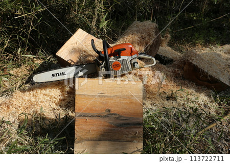 チェーンソーで半分にカットされた、大きなシラカシの玉