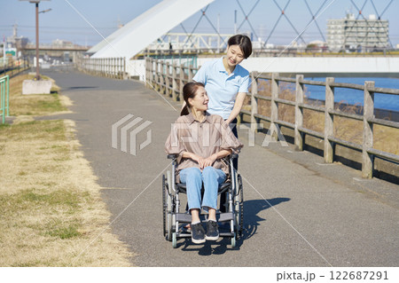 中年の女性が乗った車椅子を押して散歩する介護士