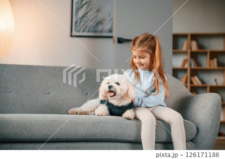 Embracing the animal. Little girl is with maltese dog indoors in domestic room