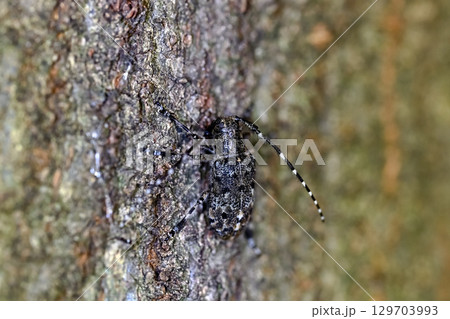 生き物 昆虫 カタシロゴマフカミキリ、灰褐色の地色に白と黒の胡麻塩模様