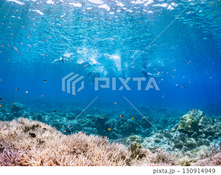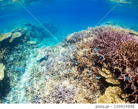 デバスズメダイ、ミスジリュウキュウスズメダイ他の群れ。巨大なサンゴ礁と熱帯魚の群れ。 沖縄県嘉比島