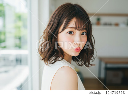 カフェの店内で口をとがらせてこちらを見つめる若い女性(AI生成画像)