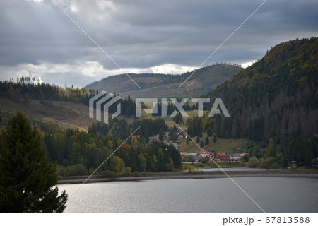 湖畔的一間農舍,山坡的樹木增添了秋意變紅變黃。