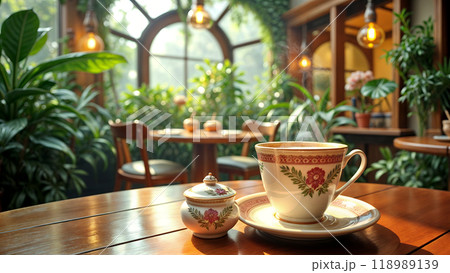 温室カフェの中。テーブルの上には、かわいいレトロなカップに入った淹れたてのコーヒー。