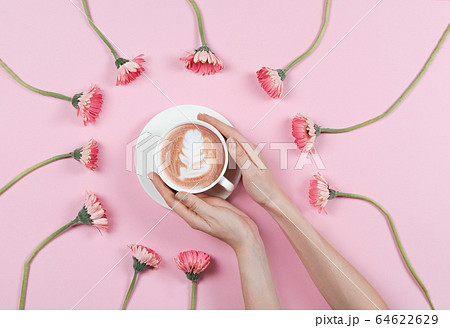 Hands holding coffee cup with flowers