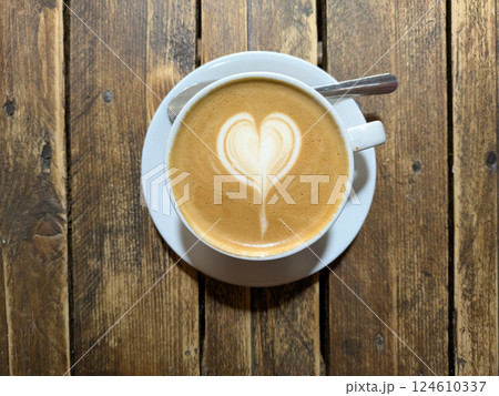 Top view of a white cup of hot cappuccino with beautiful latte art on a natural wooden table surface