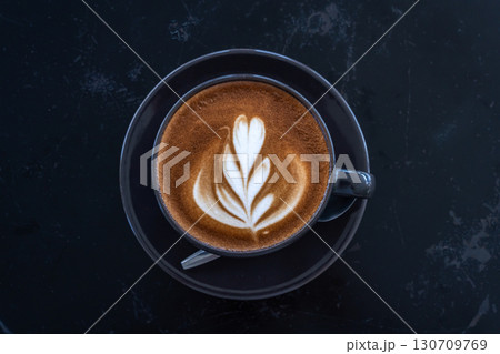 Hot coffee latte with latte art milk foam in cup mug on black wood desk on top view. As breakfast In a coffee shop at the cafe,during business work concept