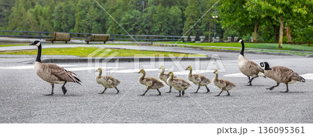 Canada geese with goslings crossing the road in a public city park.