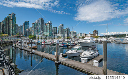Yachts and boats moored at the pier in downtown of Vancouver, Canada