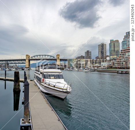 Tourist tour boat moored at the pier with Burrard bridge and Vancouver downtown on the background
