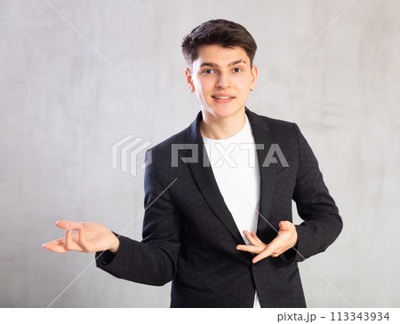 Smiling surprised young male student in suit jacket pointing at you.Portrait of guy pointing finger