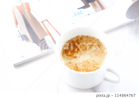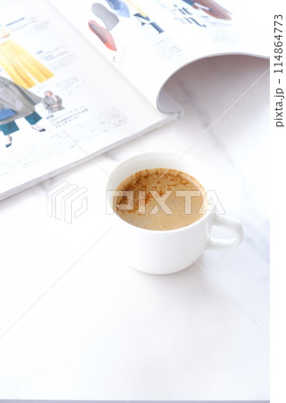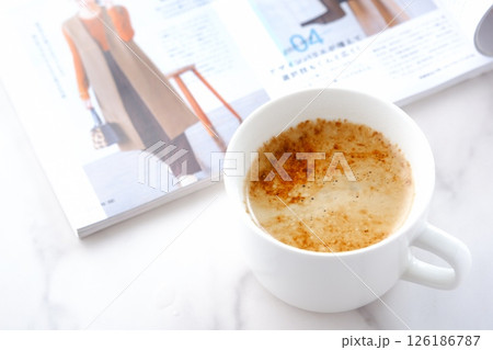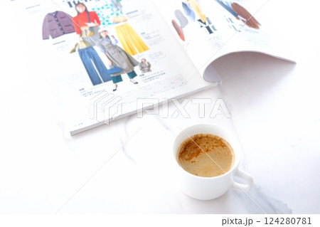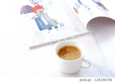 白いテーブルで、エスプレッソと牛乳を混ぜたカフェ・ラッテを飲みながら、雑誌を読んでいるイメージ