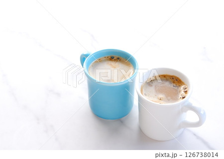 エスプレッソと牛乳を混ぜたコーヒー、カフェ・ラッテが入った、ふたつのマグカップ