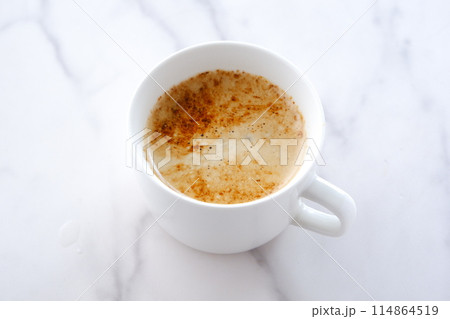エスプレッソと牛乳を混ぜたコーヒー、カフェ・ラッテを飲みながらリラックスしているイメージ