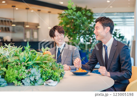 おしゃれなオフィスのカフェテリアでランチをするビジネスマン