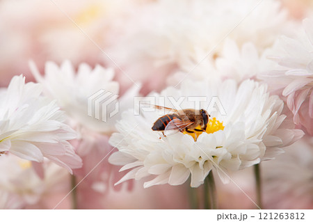Bee collects nectar on white chrysanthemums during day. Honey bee close up pollinating white flower. Nature. Ecosystem, ecology, wild and domestic environment. Copy space