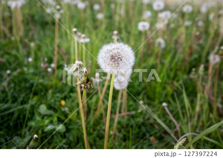 Dandelion Seed Head in Blooming Meadow with Soft Focus on Natural Green Background