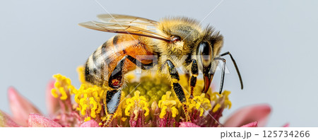Closeup of bee pollinating vibrant flower, showcasing intricate details of bee and flower pollen covered center