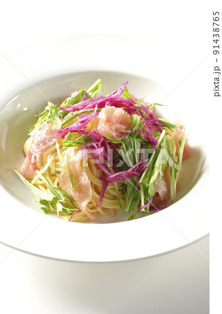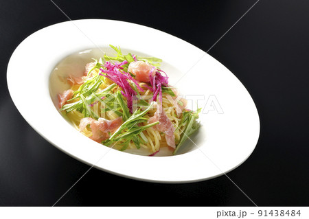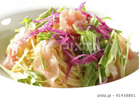 赤大根や水菜、生ハム、カッペリーニを使用した冷製パスタを白背景で撮影
