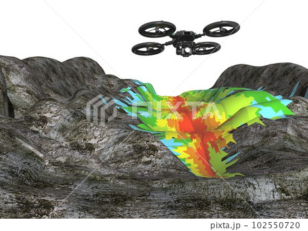 ドローンと地形、危険地帯などの3D測量、三次元測量データなどの3DCGイメージ。