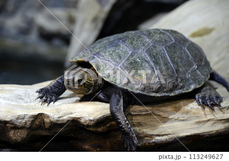 川の中の岩に上がって甲羅干ししている、少し幼いミシシッピアカミミガメ