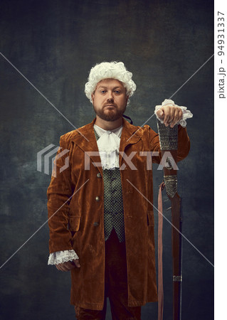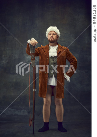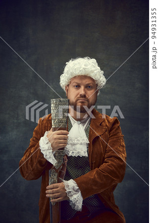 Nobleman, medieval royal person in vintage hunting clothing with old gun isolated over dark background. Art, fashion, emotions, traditions, hobby concept