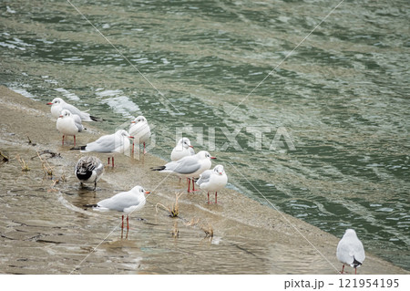 土佐堀川の畔に群れるユリカモメ 大阪市土佐堀川