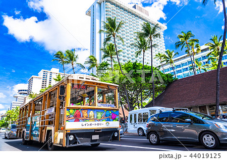 カラカウア通りの観光トロリーバス