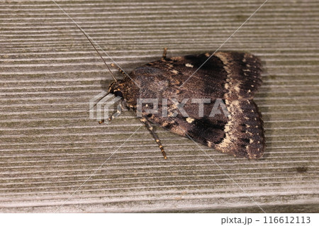 生き物 昆虫 オオシマカラスヨトウ、樹皮のように見える地味な姿。茶色地に波形の帯模様と白い円紋