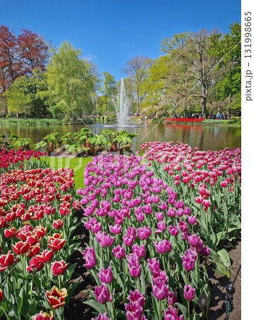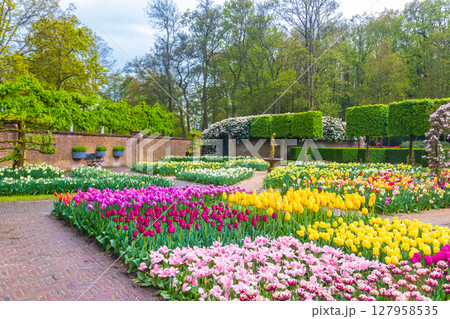 Scenic view of Keukenhof tulip garden in Lisse, Netherlands. Keukenhof is the most beautiful spring garden in the world. Beautiful ornamental garden landscape at Lisse, Netherlands