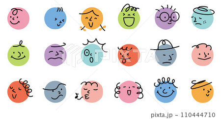 丸の上に描かれた、いろいろな色と表情の抽象的な顔のベクターイラスト