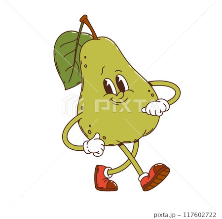 Cartoon groovy pear fruit character. Isolated vector anthropomorphic retro personage with expressive eyes, a smiling face and sneakers, cheerfully walking, exuding hippie fun and playful summer vibes