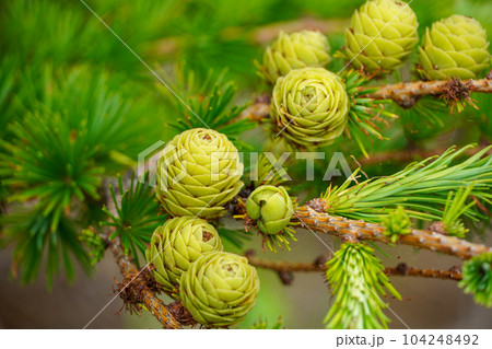 カラマツ【落葉松】の枝についている緑の松ぼっくり