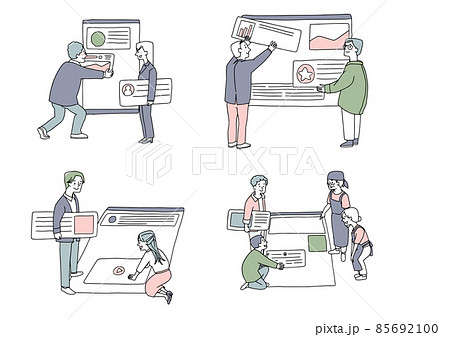 ウェブサイトのデザインについてクライアントと話し合うデザイナーの男性と女性 手描きの人物イラスト