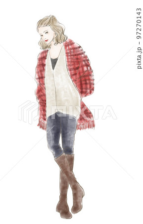 赤のチェックのストールを羽織るブーツの女性イラスト