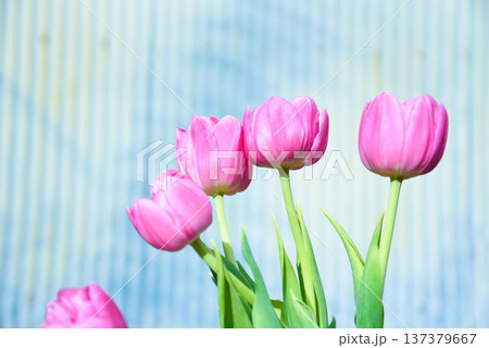 水色背景のピンク色のチューリップ
