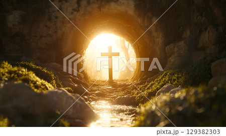 The radiant moment of Jesus' resurrection at the empty tomb during dawn light