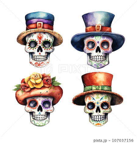 Day of the dead Colorful mexican skull with flowers watercolor illustration on white background