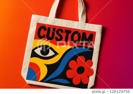 Custom printed canvas tote bag with eye and flower design on red orange gradient background