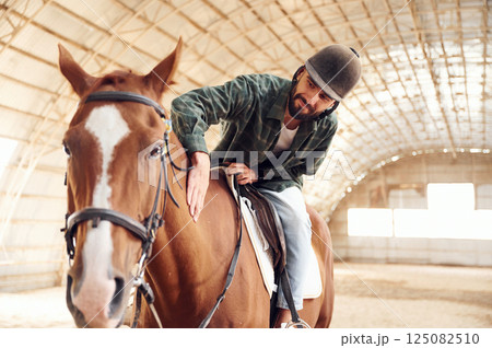 Jockey is in the saddle. Young man with a horse is in the hangar