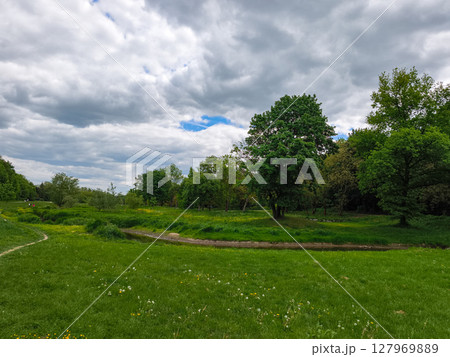 Stromovka park in prague showing lush green grass and trees under cloudy sky
