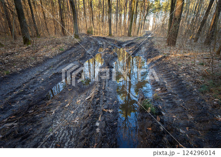 Reflection of trees in a puddle in the forest, March day, Nowiny, Lubelskie, Poland