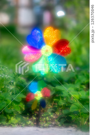 Soft focus effect Two colorful plastic pinwheels are spinning in the summer breeze, adding a touch of whimsy and joy to a garden filled with lush green plants