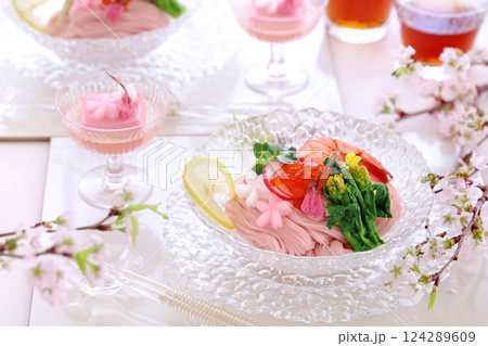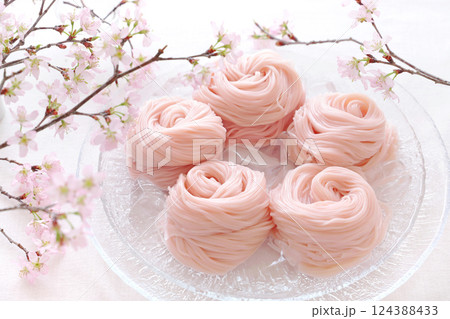 ガラス鉢に盛り付けたさくらそうめん さくら素麺 桜そうめん