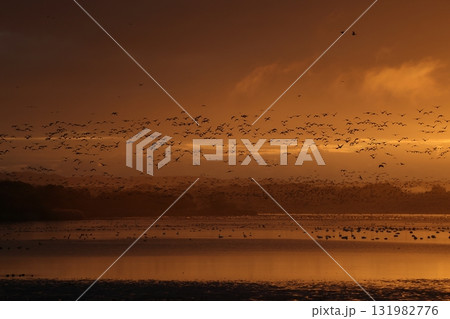 伊豆沼・朝日を浴びて塒立ちするガン達