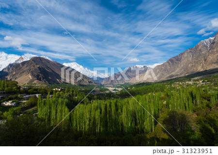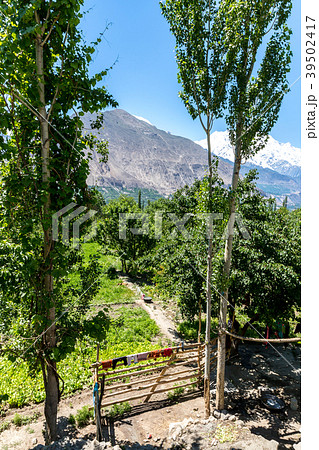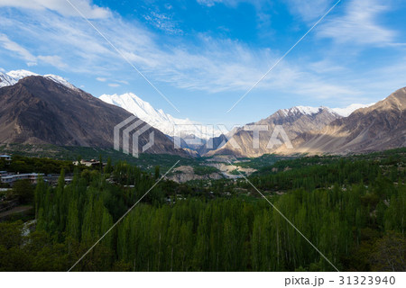 フンザ谷、カリマバードのポプラ林とカラコルム山系の見える風景