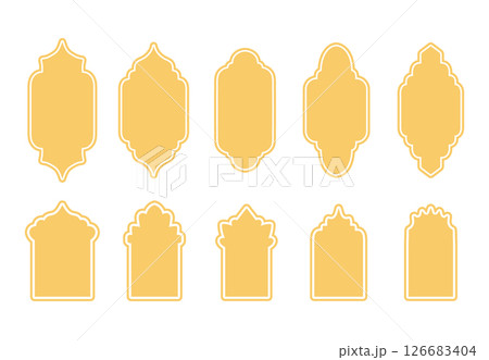 Islamic golden frame, vector shape, design template, flat element. Collection of oriental style arab windows and arches, antique luxury decor set