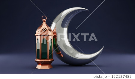 Prominent reflective silver crescent moon with a sleek copper islamic lantern for ramadan
