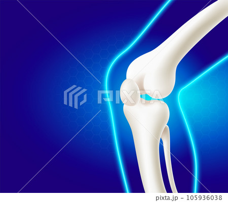 Knee joint with healthy cartilage side on blue background with copy space for text. Bone human skeleton anatomy of the body.