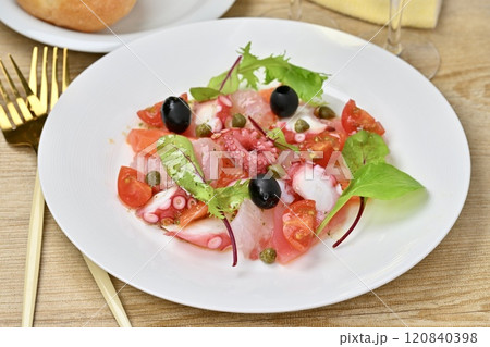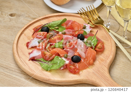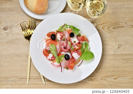 カルパッチョ、カルパッチョサラダ。サーモン、鯛、蛸、ミニトマト、ベビーリーフ、オリーブオイル。